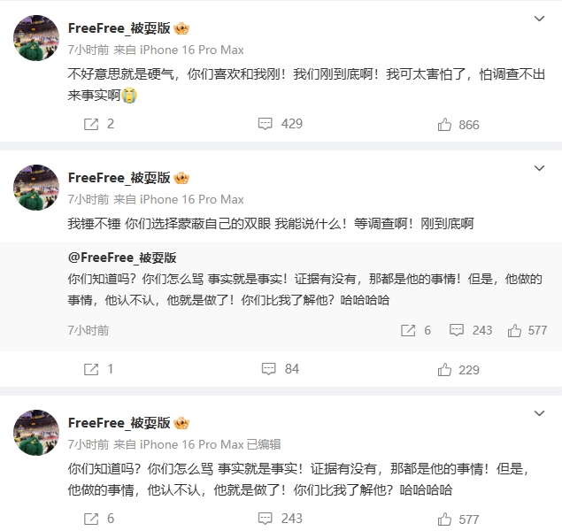 “你们知道吗?你们怎么骂 事实就是事实!证据有没有,那都是他的事情!但是,他做的事情,他认不认,他就是做了!你们比我了解他?哈哈哈哈 。”
