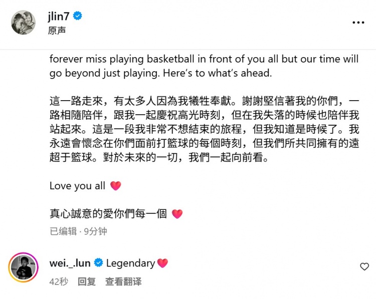 致敬!林书豪社媒宣布退役结束15年生涯 赵维伦回复:传奇❤️