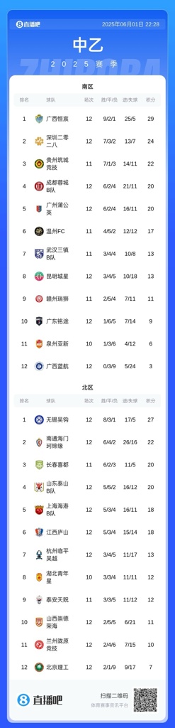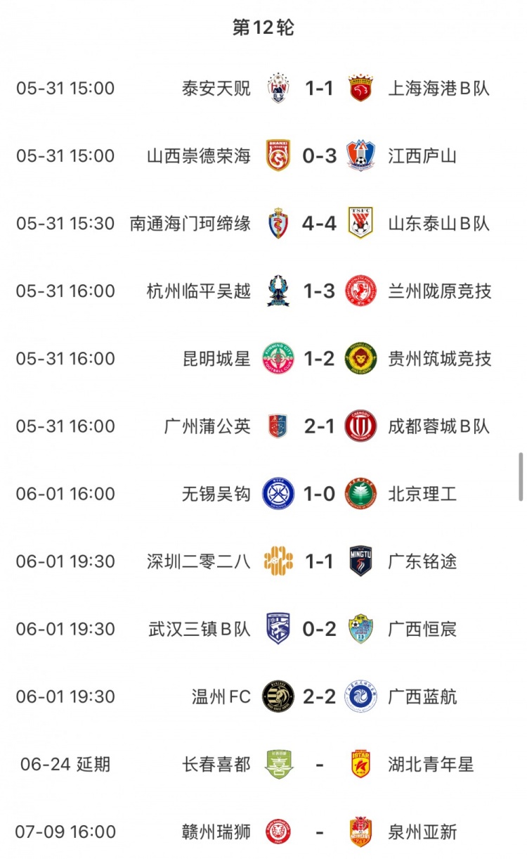 6月1日讯 中乙第12轮结束10场比赛的争夺,广西恒宸和无锡吴钩分别领跑南区和北区,泰山B队4-4战平海门珂缔缘。