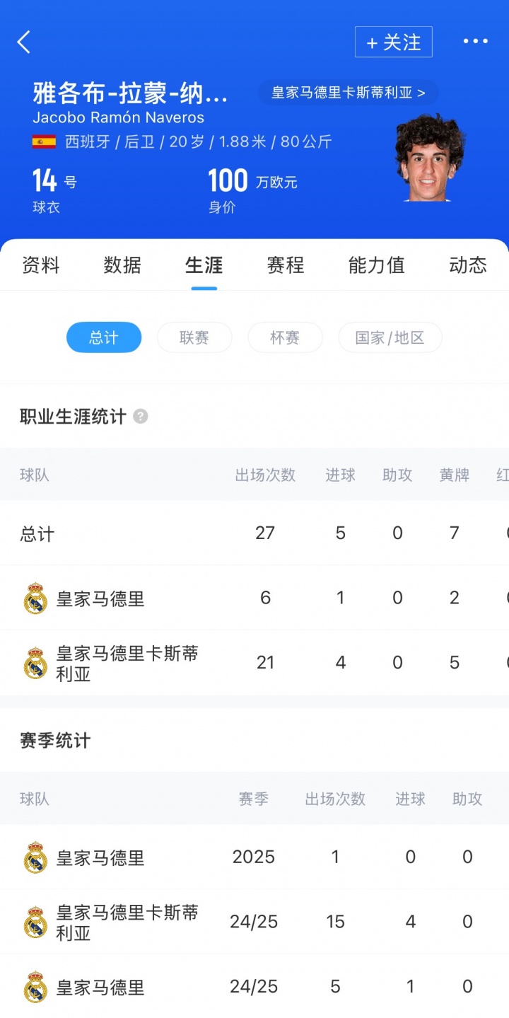 雅各布-拉蒙现年20岁,西班牙后卫,身高1米88,他目前总计为皇马一线队效力6场,打进1球。目前拉蒙身价为100万欧元。