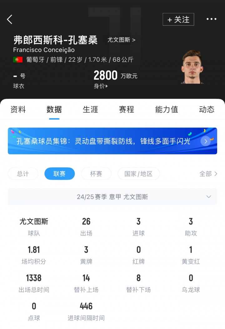 小孔塞桑现年22岁,24/25赛季租借加盟尤文,租借费1000万欧,出场40次取得7球5助攻,其中意甲26场3球3助攻。